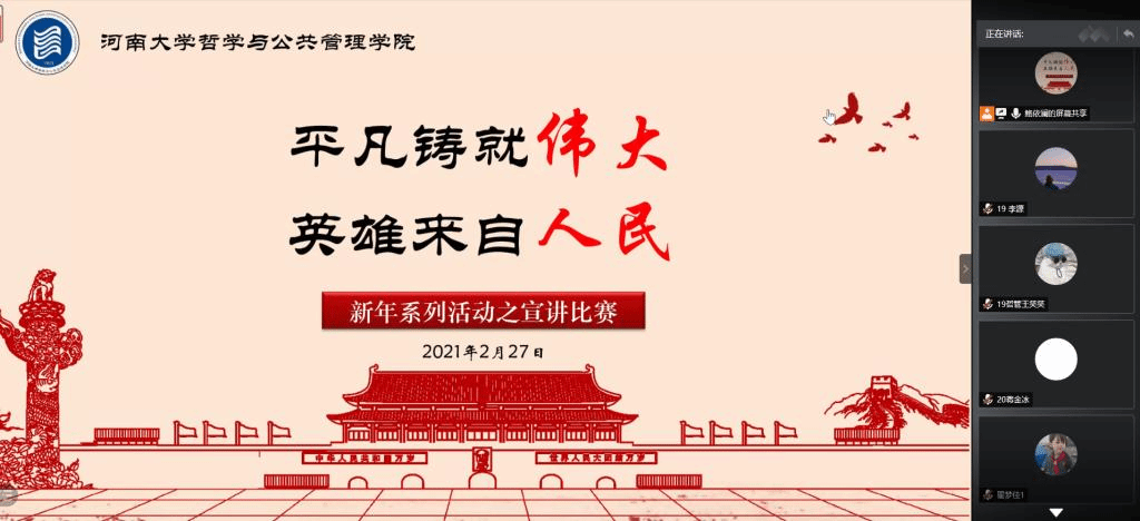 于线上开展“了不起的中国人”主题微故事宣讲比赛。平凡铸就伟大,英雄来自人民。参赛选手将眼光聚焦于身边的人和事,从抗疫情到战洪水,从抗美援朝到脱贫战场,他们声情并茂地将人民英雄的事迹娓娓道来,歌颂他们舍小家为大家、牺牲个人、忠于民族的伟大爱国主义精神。2018级行政管理专业杨佳通过讲述燃灯校长张桂梅扎根山区,坚守教育的故事,诠释了时代楷模于己克俭、为民奉献的大爱无私。2020级公共管理类专业蒋金冰用饱满情感致敬抗美援朝的可爱战士,表达了当代青年人崇尚英雄,不忘初心的理想信念。一个有希望的民族不能没有英雄,一个有前途的国家不能没有先锋,传承英雄是时代永恒不变的主题。