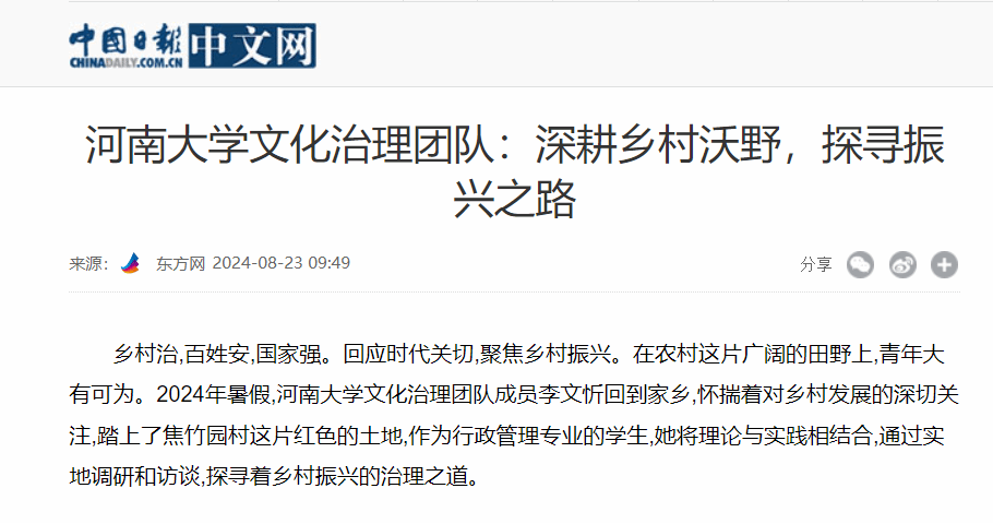 学子李文忻暑期深入河南省焦竹园村进行调研的事迹被《中国日报》报道,此次调研不仅体现了糖心视频