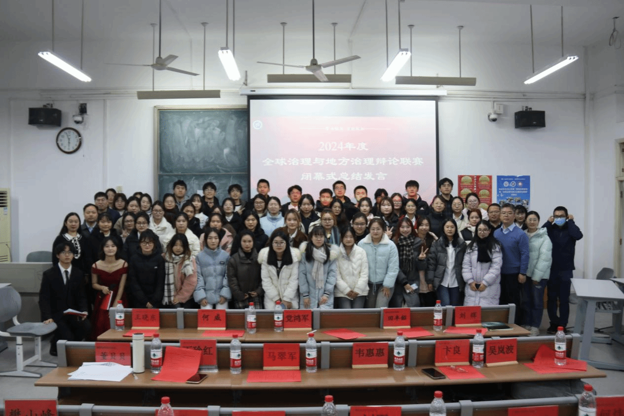 行政管理专业2024年度“国家治理剧场”暨“全球治理与地方治理”辩论联赛闭幕式在金明校区综合教学楼6301举行。学院党委书记党鸿军,副书记何威,副院长田丰韶、王晓东、刘辉,团委负责人李蓓,行政管理系马翠军、何炜、吴岚波、韦惠惠、卞良、于海利、樊山峰、刘露、董贝贝等老师及2022级行政管理专业全体同学参加闭幕式。