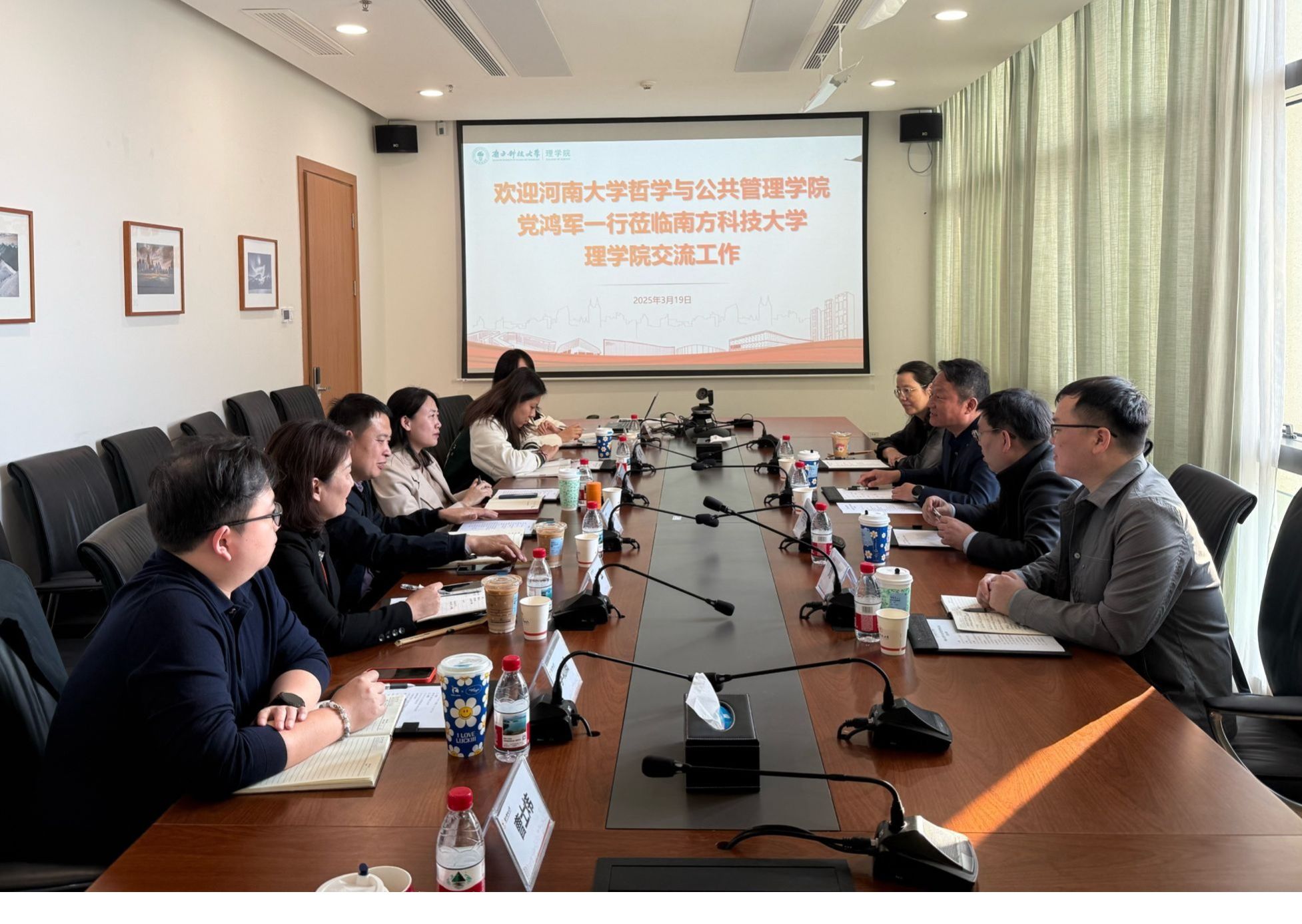 领导老师的到来表示欢迎,并向调研团队介绍了学院组织架构、人才培育、科学研究和社会服务等基本情况。其中,以理学院党委入选广东省“党建工作标杆院系”培育创建单位为重点,详细分享了学院党建示范创建与质量创优工作经验和学生思想政治工作创新经验。党鸿军对南方科技大学理学院的热情接待表示感谢,在向参会领导老师介绍学院发展、专业建设、师资力量等情况的基础上,依托学院“1347”工程和“三为”育人领航计划阐释了学院党建思政的工作理念与方式方法。交流环节,双方围绕网络思政、青年教师培育、党团建设等问题进行了深入交流。