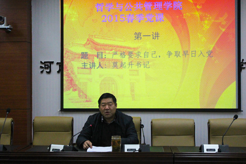 在院三楼大会议室举办2015年春季党课培训,院党委书记莫起升围绕“严格要求自己,争取早日入党”主题开始了党课培训的第一讲内容。