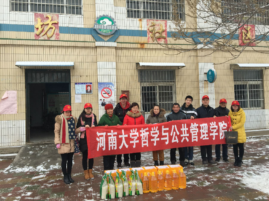 研究生会同学与开封市至善社工服务中心代表一起来到开封市油坊社区,在给社区多户特困家庭送去大米、油、面包等慰问品的同时,也与特困家庭老人们促膝谈心,帮助他们排遣孤独,以期能够让他们度过一个美好快乐的春节。活动期间正值开封年内首场大雪,为确保社区内机动车、行人安全,活动结束时,同学们还义务为油坊社区主路铲除了积雪。