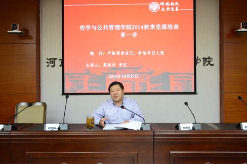 莫起升对参加党课培训的同学表示热烈地欢迎。他从四个方面对本次主题进行阐述。一是解决入党动机问题。他指出一个优秀的党员不仅仅是组织上入党,更要思想上入党。树立正确的入党动机是党员高素质行为的重要表现,是党战斗力的重要来源。二是怎样创造条件加入党组织。他指出,要认真学习马克思主义理论,学好十八大重要精神,贯彻落实党的一系列重要指导思想。不能让思想留在纸上,而是要切实的深入精髓,贯彻学习,指导行为。三是以实际行动争取早日入党。深入理解党的意义,加强党政学习。重视大学学习,积极参加课余活动。四是入党后应当如何做。大学生应勤于实践,严于律己。同时,要正确处理好个人与集体的关系,贯彻党的群众观点、群众路线,以人民利益为重,实现好、维护好广大人民群众的根本利益。