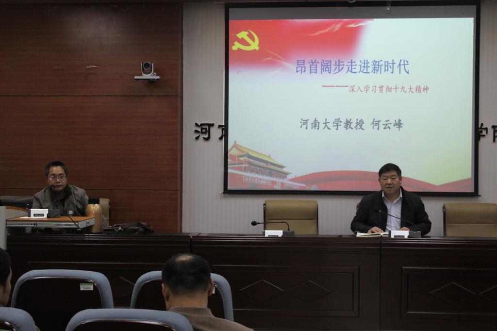 在第一会议室召开了“党的十九大精神报告会。”校宣讲团成员何云峰教授以“昂首阔步走进新时代”为主题做专题讲座。学院全体教职工及学生党员聆听了报告,会议由学院党委书记莫起升主持。