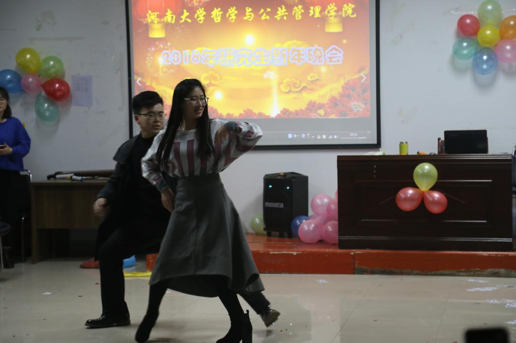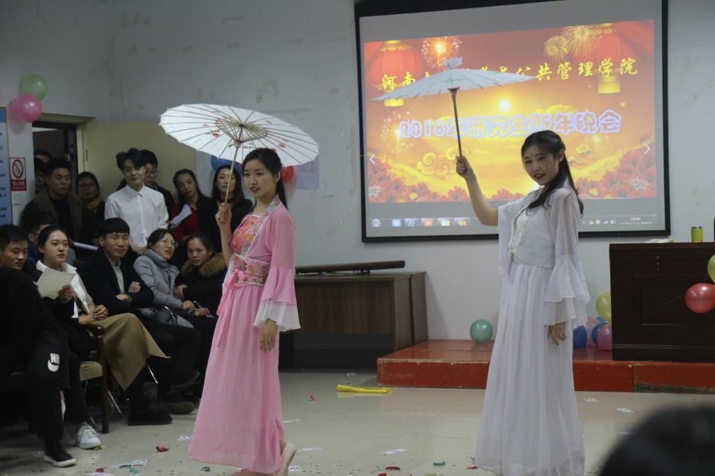 晚会开场之际,由2016级研究生同学以热舞《Nobody》为晚会拉开了精彩序幕。晚会内容流行与古典并举,温情与火热兼收,形式多样,精彩纷呈。首先是歌曲串烧,朝气蓬勃,乐感十足,激发出在场同学们内心的热情。接着,现代版宫斗剧《甄嬛后传》劲爆上演,表演者身着古装,面带喜感,将剧中人物形象完美地表现出来,引得全场喝彩;双人舞《Trouble maker》《青蛇》和集体舞《Bar Bar Bar》《失恋阵线联盟》或性感妩媚,惊艳全场,或活力四射,轻快悠扬,将整个晚会推向高潮,引得笑声不断,掌声连连;古筝《佳人曲》、对唱歌曲《甜蜜约定》以及独唱歌曲《趁早》让观众心旷神怡,陶醉其中;相声《男儿当自强》和小品《TFgirls》《昨天,今天,明天》以及《非诚勿扰》更是笑料不断,逗得观众捧腹大笑;走秀节目《维多利亚的秘密》形式新颖别致、独具一格,收获不少好评。最后,改编歌曲《河大的日子》唱响,晚会在优美的旋律下完美落幕。收尾之际,乔老师和李老师分别亲切地表达了自己对晚会圆满成功的喜悦以及对我们所寄寓的美好希望。