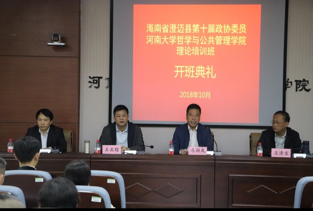 三楼第一会议室正式开班。学院党委书记马润成、副院长蒋军营、澄迈县政治协商会议第十届委员会副主席王丕煌、副主席吴清宝出席开班典礼。50余名县政协委员参加培训。
