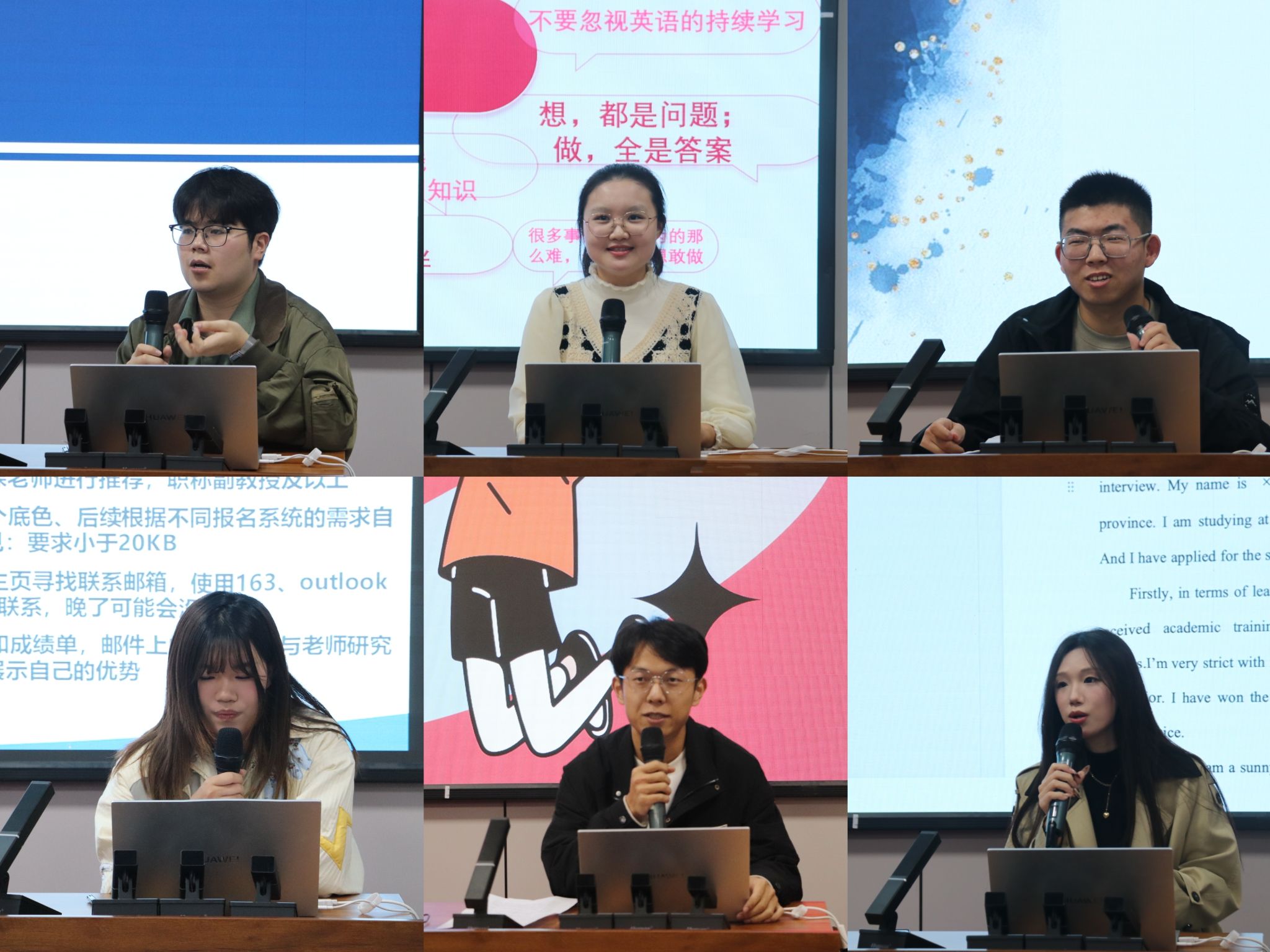 行政管理专业王泽臣结合自身保研经验,仔细分析了不同年级的同学应如何规划大学生活并鼓励大家在实践中积累经验,打牢基础。李董祺从日常学习、学术科研、大型竞赛、英语学习四个方面进行分享,她建议大家要全面提升自己的能力以及针对目标院校招生需求有侧重地发展自我。哲学专业丁煜惠从保研流程、材料准备、面试技巧、心态调节等多个方面建议大家要调整心态,迎难而上。张育鑫从自己的保研经历出发,鼓励大家及时制定计划,不断探索与尝试,要敢投敢报,及时调整方向,把握住一切能被录取的机会。劳动与社会保障专业陈浩翔从合理分配时间建议大家要将有限的精力投入到有意义的事情上。社会工作专业汪心怡从提升学业的重要性角度鼓励大家希望能不断提升专业水平,把握课堂学习,珍惜校园生活,不断提升自我。