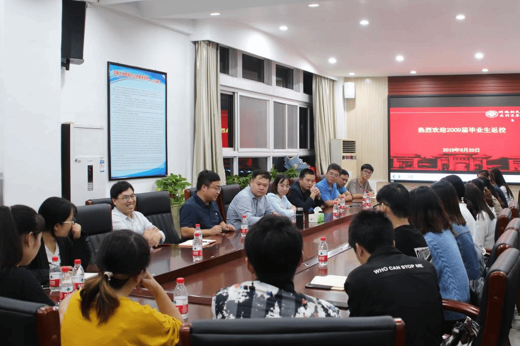 2009届毕业生返校交流会在学院第二会议室举行,学院相关教师及学生代表参与其中。会议由刘辉老师主持。