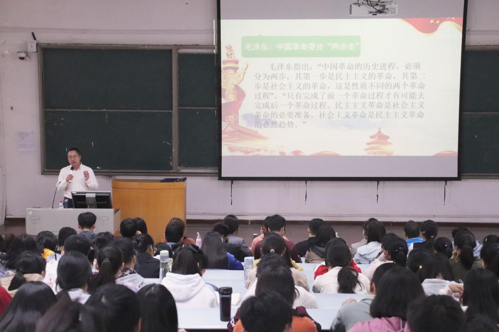 政治系何云峰教授在金明校区综合楼2406教室做“从站起来到强起来—新中国70年奋斗历程回眸”主题报告。学院全体辅导员、学生党员及入党积极分子聆听了报告。