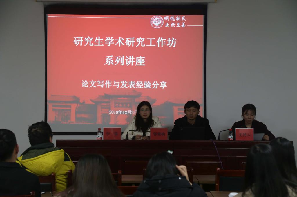 研究生学生会学术部部长李曼娜主持,2017级优秀研究生代表李雪、郭豪楠分别就自身在学术论文写作及投稿发表过程中积累的丰富经验与大家进行分享交流。研究生辅导员乔志灵和18、19级研究生参加了此次活动。