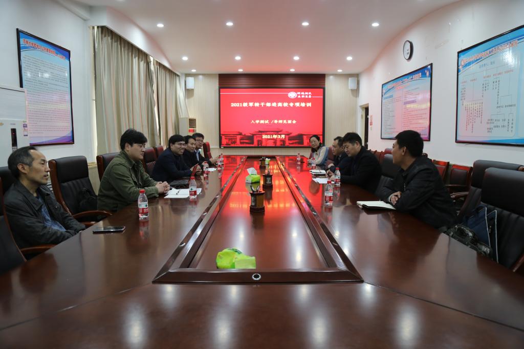 2021级军转干部进高校专项培训导师见面会在学院三楼第二会议室召开。学院副院长蒋军营、田丰韶,学院成教办公室主任丁玲红,行政管理系刘辉老师、政治系孙艮陶老师、社会工作系付光伟老师以及三位军转干部学员出席本次会议。