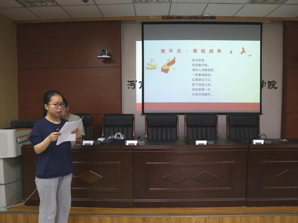 接下来,王笑笑等12名党员同志对精选诗词进行赏析,他们结合革命历史,介绍了诗词的创作背景,透过诗词让我们重温了党进行革命的光辉历程。 王笑笑同志分享《西江月·秋收起义》时讲到“从秋收起义看中国革命”,她说:“历经了血雨腥风的革命文化见证了‘没有共产党,就没有新中国’的苦难辉煌,凝结着中国共产党人一心为民、坚定执着、视死如归、不惧艰险、勇于担当、乐观豪迈的革命精神和崇高品格。”赵媛媛讲述《减字木兰花·广昌路上》谈及井冈山精神,“何谓井冈山精神?是实事求是,敢闯新路的精神。敢于改变策略,从农村包围城市,敢于开拓疆土,仗剑直言:“十万工农下吉安”的豪迈,是坚定信念,矢志不移,从而造就“星星之火,可以燎原”之势,是依靠群众、艰苦奋斗,通过自力更生,改变现状的坚韧不拔。”吕晨冉结合《菩萨蛮·大柏地》为我们讲述了红四军转战赣南闽西的一次战役——大柏地战斗,是一次开辟中央革命根据地新局面的重要战役。