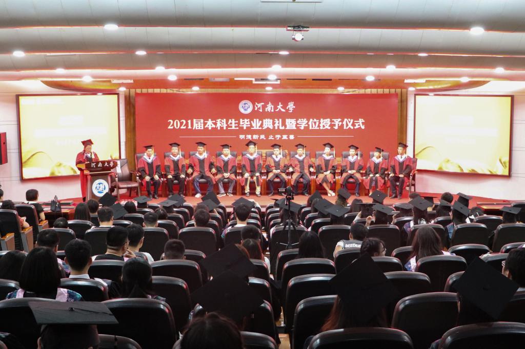 学院党委书记马润成向圆满完成学业的2021届本科生表示祝贺。他表示,四年的专属回忆流淌在学院发展历程中,充满温暖,弥足珍贵;无数的奖励荣誉摆放在学院成长之路上,夺目耀眼,令人骄傲。离别到来,但未来可期,希望每位学子牢记“前瞻开放、面向世界,坚持真理、追求进步,百折不挠、自强不息,兼容并包、海纳百川,不事浮华、严谨朴实”的河大精神,以敬畏和至美的人生态度,创造辉煌事业,书写精彩人生。