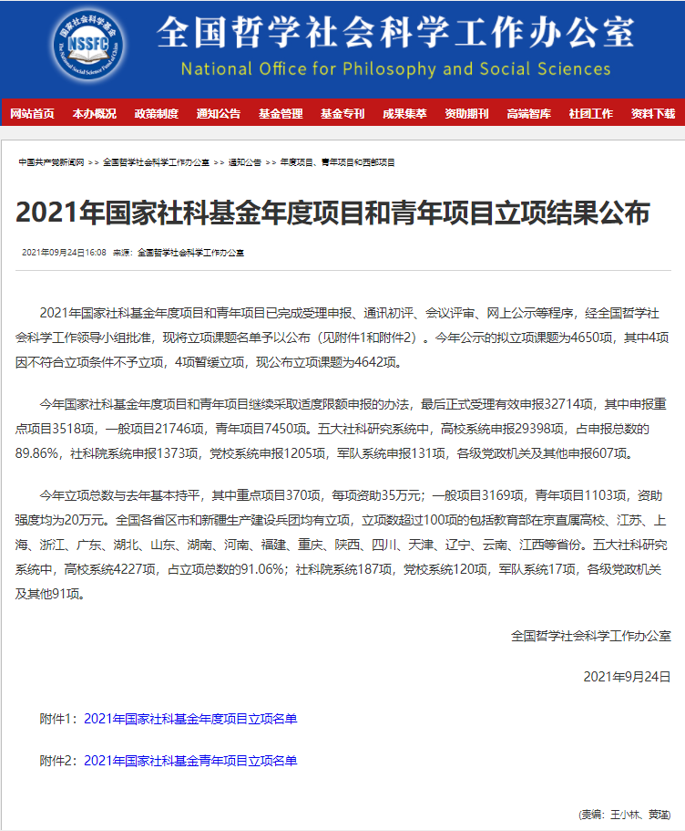 2021年9月24日,全国哲学社会科学工作办公室公布了2021年国家社科基金年度项目和青年项目立项结果。