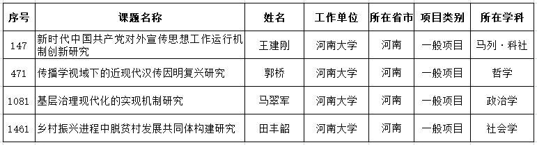 王建刚老师的“新时代中国共产党对外宣传思想工作运行机制创新研究”获批马列·科社学科一般项目立项,郭桥老师的“传播学视域下的近现代汉传因明复兴研究”获批哲学学科一般项目立项,马翠军老师的“基层治理现代化的实现机制研究”获批政治学学科一般项目立项,田丰韶老师的“乡村振兴进程中脱贫村发展共同体构建研究”获批社会学学科一般项目立项。