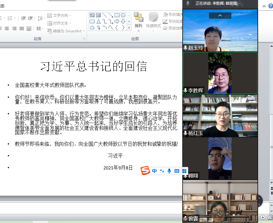 9月20日-9月30日,学院6个教工党支部分别以各种形式深入学习贯彻习近平总书记给全国高校黄大年式教师团队代表的重要回信,把贯彻落实总书记重要回信精神与党史学习教育、推进教育高质量发展结合起来。9月22日,院党委将学习贯彻习近平总书记教师节给全国高校黄大年式教师团队代表回信精神作为党委会第一议题,进行了集中学习研讨。旨在通过对回信的学习,将黄大年精神融入学院教师职业素质提升和师德师风建设中。其中,校党建工作样板党支部——哲学系教工党支部,通过线上方式举行了“习近平总书记给全国高校黄大年式教师团队代表的回信”专题研讨。全体党员认真学习,撰写心得,并再次集体重温了黄大年同志的先进事迹。大家表示要弘扬黄大年同志的高尚精神,当好学生成长的引路人,坚守教育立德树人初心,牢记为党育人为国育才使命。吕世荣教授表示,黄大年的精神和思想值得我们学习的很多,但主要是爱国精神。所谓爱国,在不同阶段有不同的内涵和表现。革命年代,上战场消灭敌人,保护人民生命安全,是爱国;建设年代,解决社会发展中的重大和关键问题,也是爱国。我们是哲学教育工作者,如何能抓着社会发展中的真问题进行研究,为解决社会发展中的真问题贡献智慧同样是爱国。赵清文教授说,教师之于学生,不但要传道授业、答疑解惑,而且要立德修身、行为世范,既要做好“业师”,更要做好“人师”。而要达到这一目标,高校教师不但要在教学和科研上努力探索和提升,做到精益求精;而且在品德修养上要严格要求,做到言传身教。