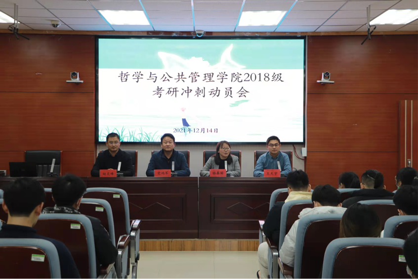 于学院第一会议室举行2018级考研冲刺动员会。学院党委书记党鸿军、党委副书记骆春丽、副院长赵炎峰、2018级辅导员王天宇代表学院师生为考研学子送上真挚祝福。