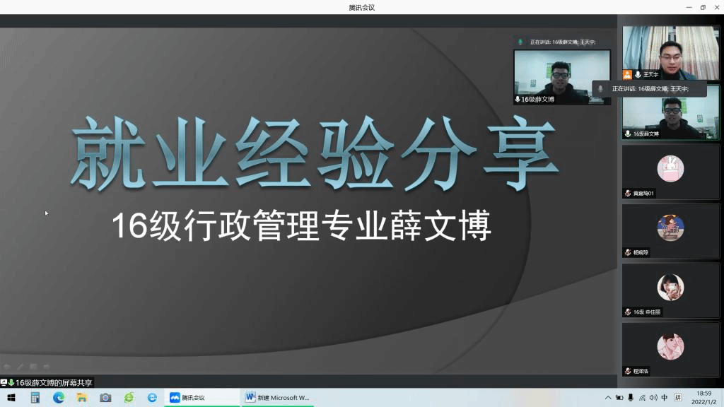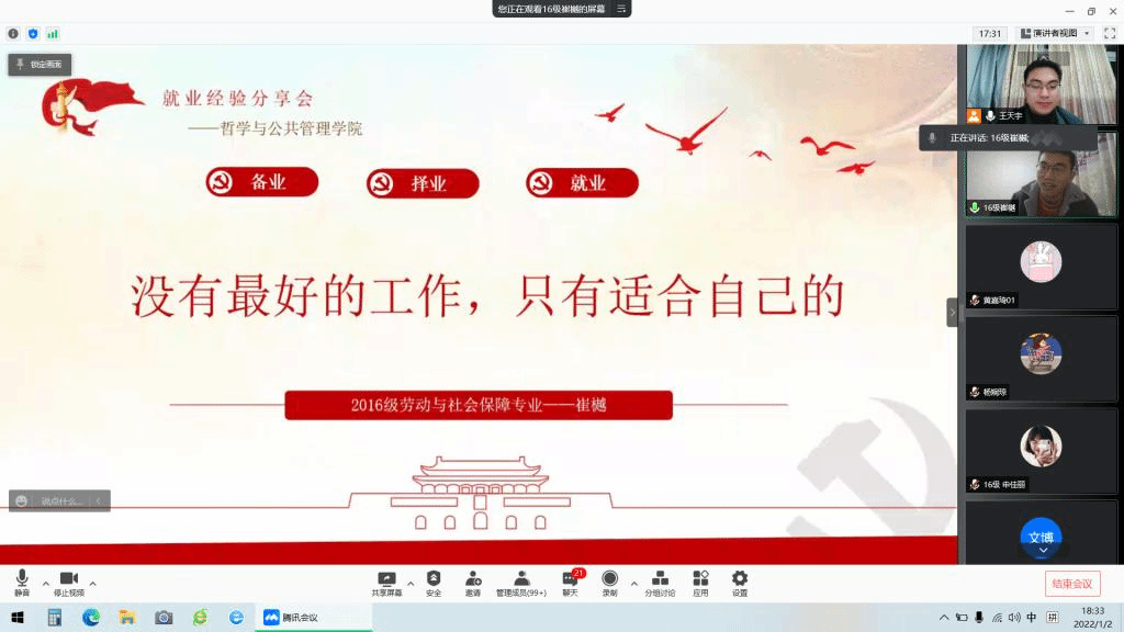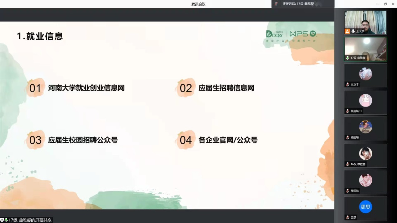 举行线上就业经验分享会。5位优秀毕业生受邀进行分享,全体应届本科毕业生参加本次会议。会议由辅导员王天宇主持。