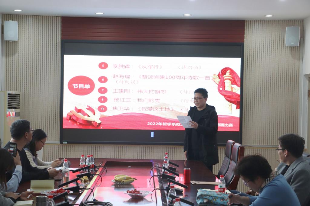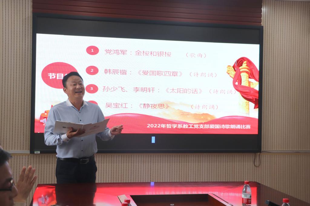 哲学系教工党支部在学院第二会议室举办了“凝心聚力,共创辉煌”诗歌朗诵活动。学院党委书记党鸿军、学院党委副书记骆春丽受邀出席活动,哲学系教工党支部全体党员踊跃参与,活动由哲学系教工党支部书记焦卫华主持。