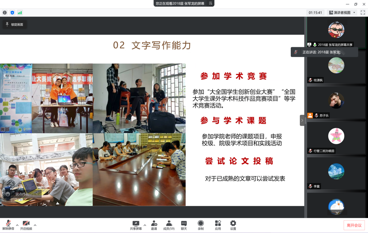 2014级行政管理专业的张军龙分享了自己作为选调生的从业经历。他根据自身经历,从文献阅读能力、文字写作能力、沟通交流能力、总结思考能力、团队合作能力等多个方面为同学们进行讲解,并辅以精彩的案例。他希望学弟学妹要敢于实践、善于沟通、锻炼本领、提升能力。