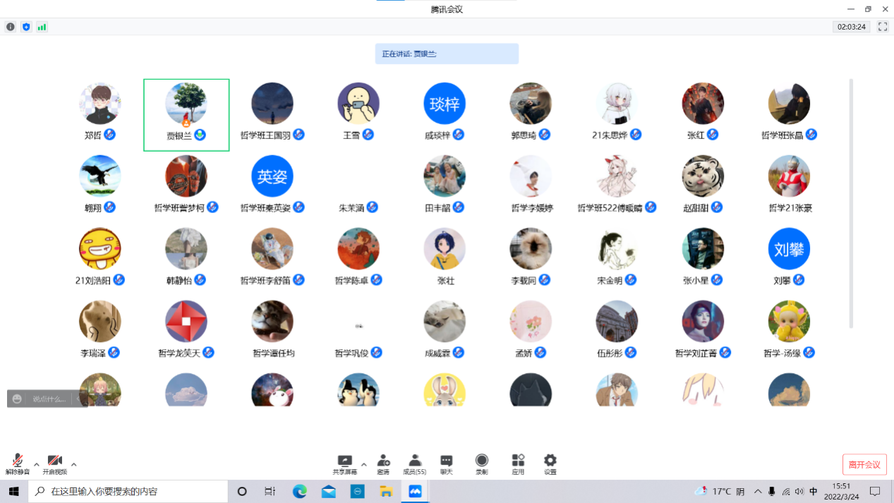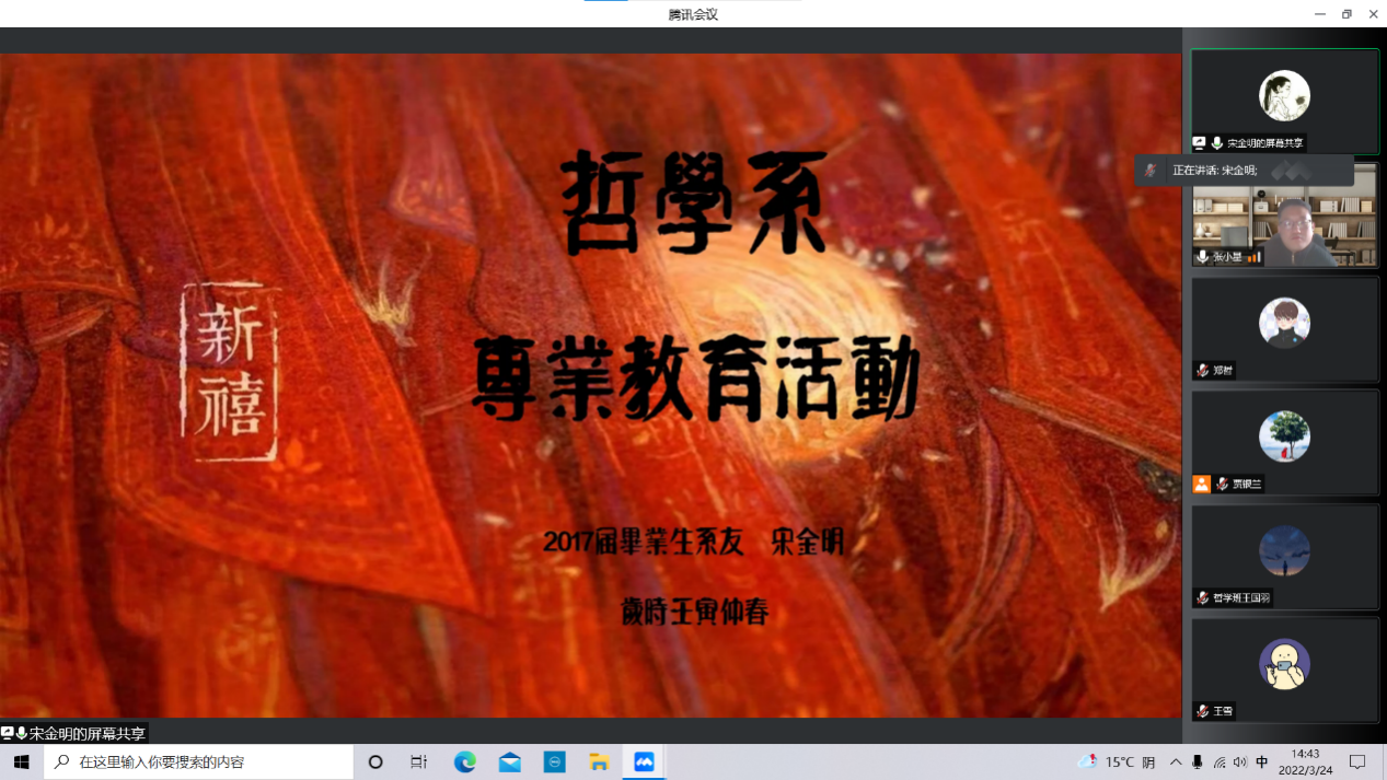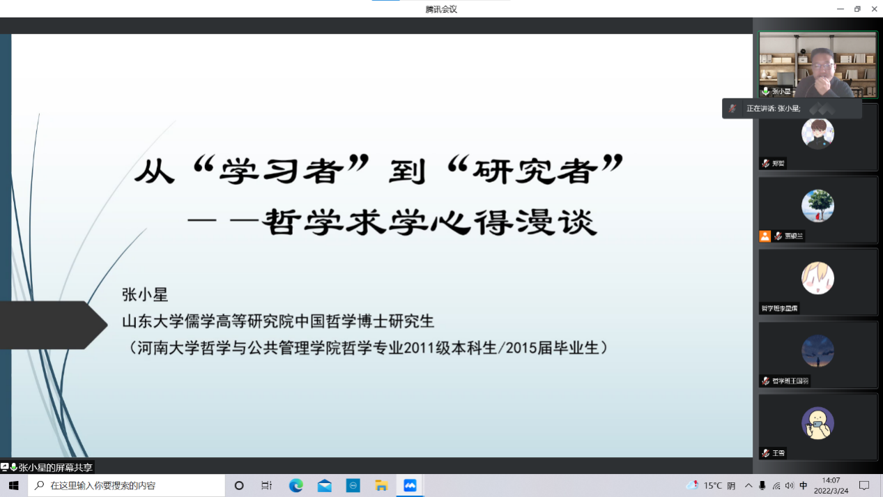 于线上举办2021级哲学专业教育大会。学院副院长田丰韶、哲学系教师代表、哲学专业优秀校友代表应邀参会,2021级哲学专业全体本科生参加,会议由哲学系系主任王建刚主持。