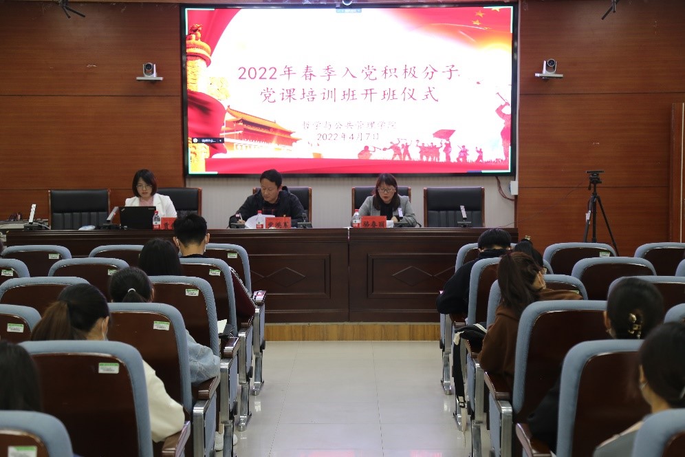 2022年春季入党积极分子党课培训班开班仪式在学院第一会议室举行。仪式以线上线下结合的方式举行。学院党委书记党鸿军、学院党委副书记骆春丽、学院党委办公室主任贾银兰以及全体培训班成员共120余人参加本次仪式。仪式由贾银兰主持。
