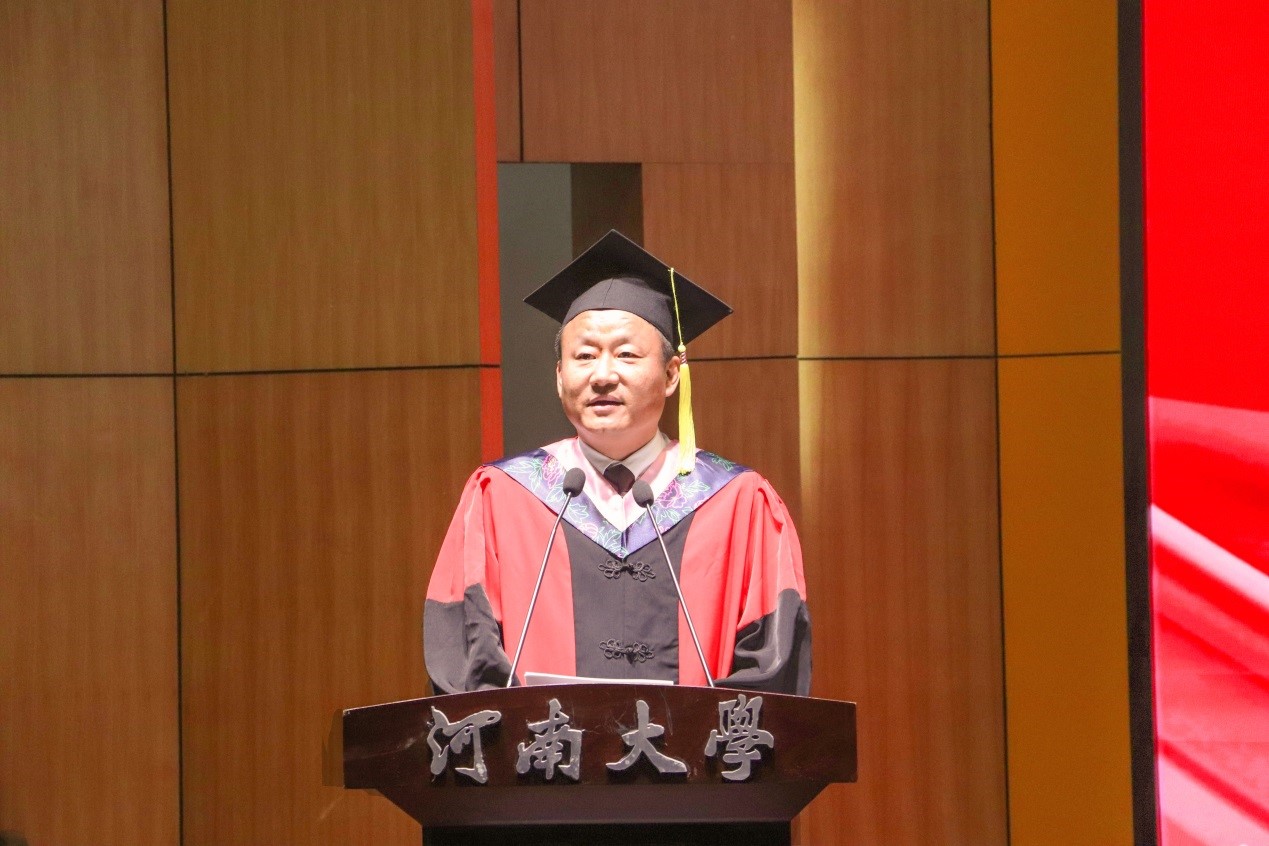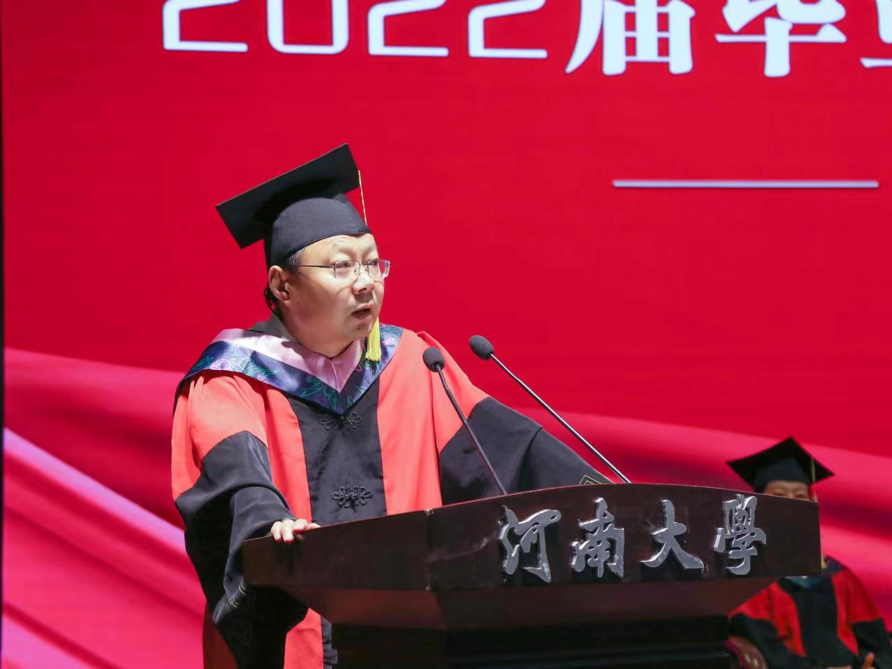 许绍康代表学校向毕业生表示最热烈的祝贺,向辛勤培育的老师表示最诚挚的感谢,并对同学们提出殷殷嘱托:一是以筑梦中国之使命,修炼“小我”成就“大我”,将“个人梦”融入实现“中国梦”的过程中,常怀爱国之情、砥砺强国之志、实践报国之行,更好地实现人生价值;二是以明德新民之精神,接续奋斗赓续荣光,担负起“铁塔牌”学子的责任和担当,做一个明事理的人、有德性的人,做新时代“自强不息,百折不挠”的河大人;三是以奔赴理想之豪情,拥抱变化赢得未来,以坚定的信仰信念信心拥抱未来,用实干苦干赢得属于自己的幸福人生。