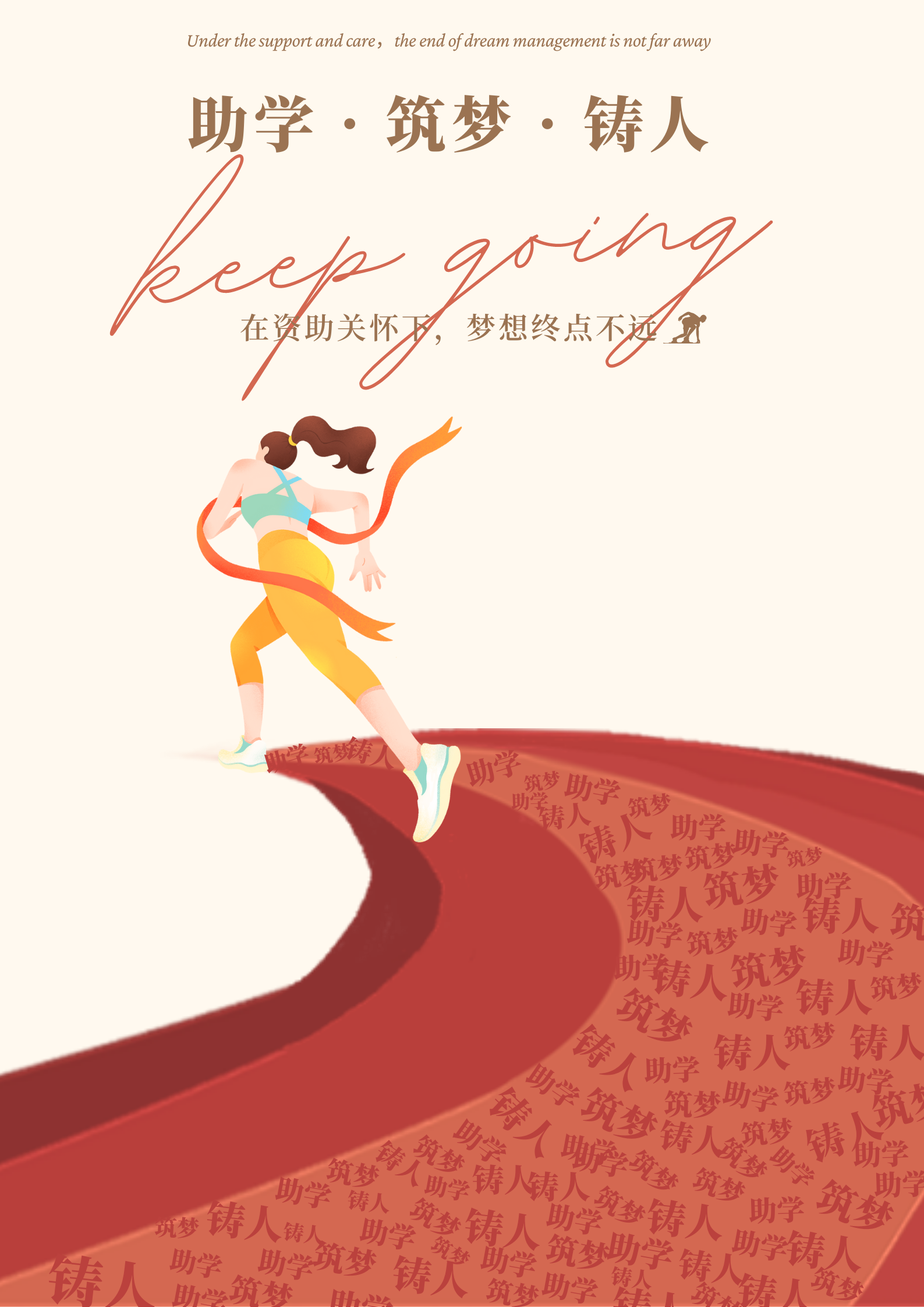 作品简介:海报以蓝天、草地、跑道为主要背景元素,象征充满青春活力的校园环境。海报中的四个青年,或在运动挥洒汗水,或在弹奏吉他,或在阅读书籍,共同闪耀青春光芒。而在校园生活多姿多彩、青春梦想纵情飞扬的背后,正是国家资助政策的支持与助力。