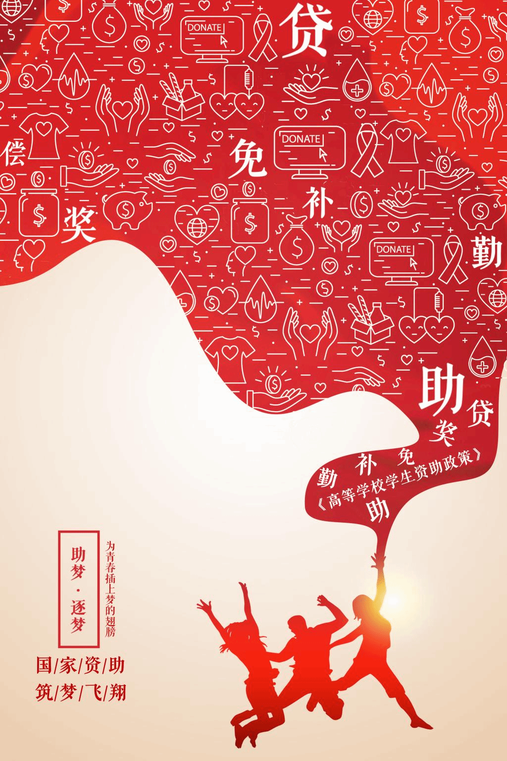 作品简介:以红色为主色调,三个青年跳跃姿态的剪影为主体,将高校学生资助体系从“偿、贷、免、补、奖、助、勤”七个关键字方面予以突出。