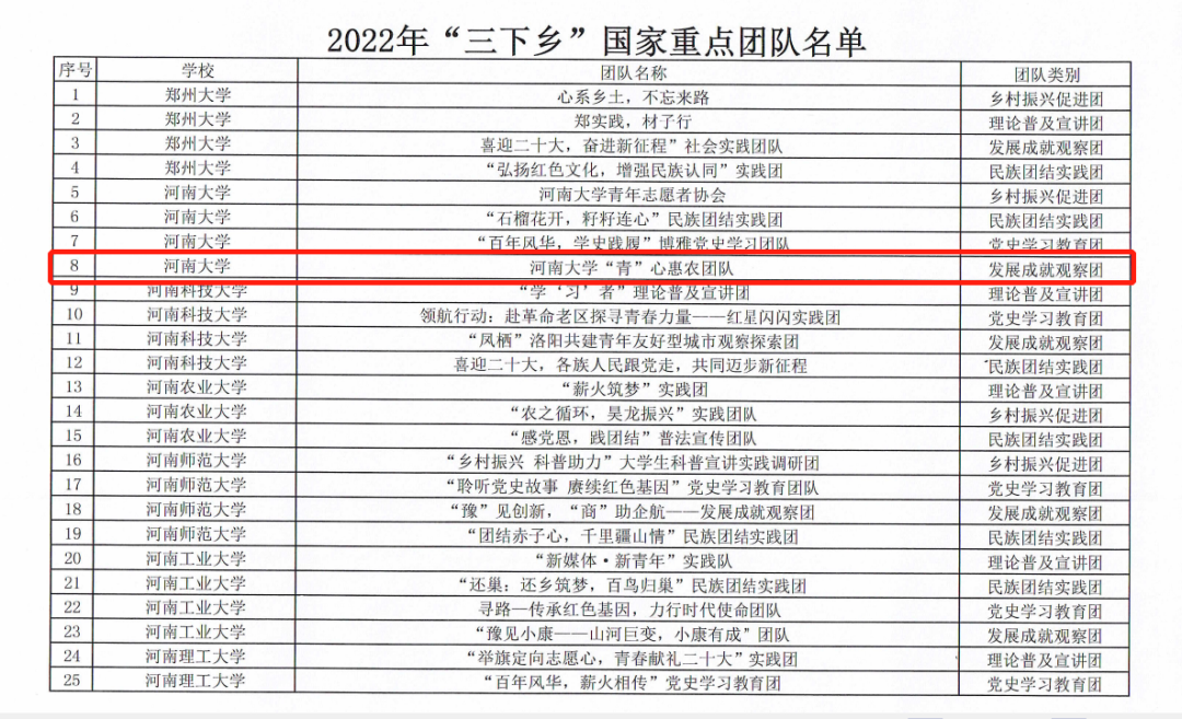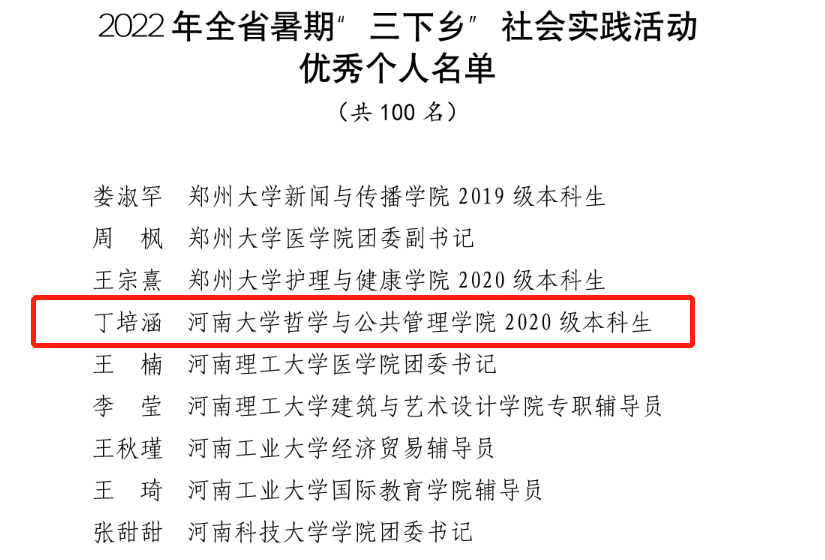 据悉,糖心视频 “青”心惠农团队经学校考核、省级选拔,成功获得2022年“三下乡”国家重点团队立项;其中,2020级本科生丁培涵积极参与策划学院暑假“三下乡”社会实践活动,并作为该团队的副队长,在“三下乡”工作中表现突出,被共青团河南省委评选为2022年全省暑期“三下乡”社会实践活动优秀个人。