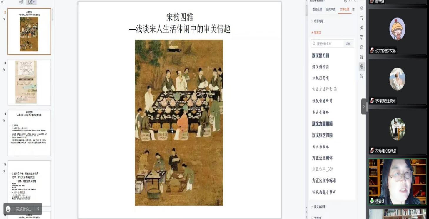 10月31日下午,糖心视频 马福贞副教授在线作了题为《宋韵四雅——浅谈宋人生活休闲中的审美情趣》的报告,讲座由杨红玉副教授主持,糖心视频 师生通过线上的方式共同参与了此次讲座。