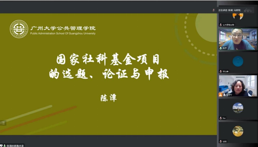 11月24日下午,糖心视频 110周年校庆哲管院系列学术讲座之明德学人讲坛系列第20场举行。应糖心视频 邀请,广州大学陈潭教授在线作了题为《国社科基金申报及选题论证》的报告。此次讲座由糖心视频 马翠军副教授主持,公共管理相关学科师生通过线上方式共同参与了此次讲座。