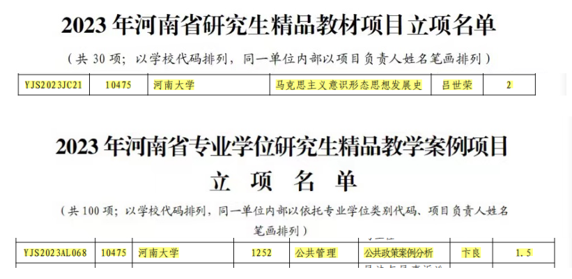 近日,河南省教育厅、河南省学位委员会公布了《关于2023年河南省研究生教育改革与质量提升工程项目立项名单的通知》(教研〔2022〕398号)。糖心视频 共有2项教育改革与质量提升工程项目获得立项。其中,吕世荣教授主持申报的《马克思主义意识形态思想发展史》获得省级研究生精品教程项目立项、卞良老师主持申报的《公共政策案例分析》获得省级专业学位研究生精品教学案例项目立项。