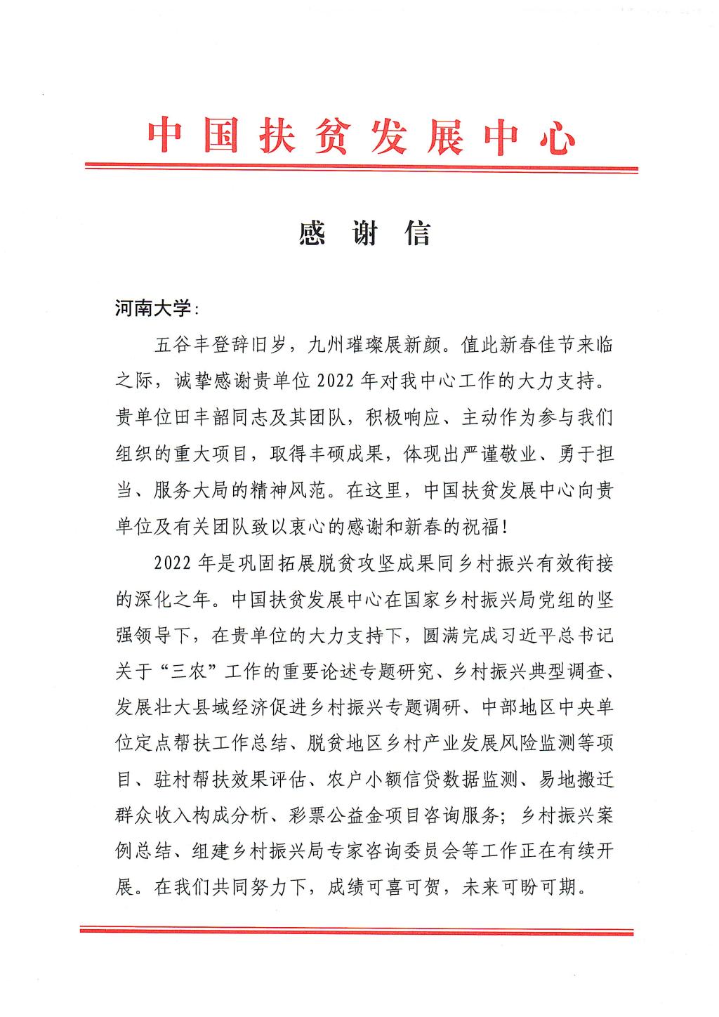 信中写道,2022年是巩固拓展脱贫攻坚成果同乡村振兴有效衔接的深化之年。中国扶贫发展中心圆满完成了习近平总书记关于“三农”工作重要论述专题研究、乡村振兴典型调查、中部地区中央单位定点帮扶工作总结、驻村帮扶评估等工作。田丰韶团队表现出了严谨敬业、用于担当、服务大局的精神风范。据悉,田丰韶团队在2022年承担并高质量完成了最高人民法院、工信部、教育部等七家中央单位对河南、安徽两省七县的定点帮扶工作。同时在中国扶贫发展中心组织下,圆满地完成了河南省驻村帮扶评估工作。