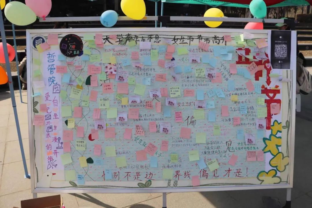 纸短情长,扬女性风采。“消灭偏见 爱自己是终身浪漫的开始”,载着娟秀祝福的卡片或贴在“偏见墙”上,展现打破偏见的独立与力量,或挂在空中,伴随三月春风将祝福传至更远方。女生们挑选心仪的故事与祝福留下合照,传递美好祝愿,尽显女生风采。