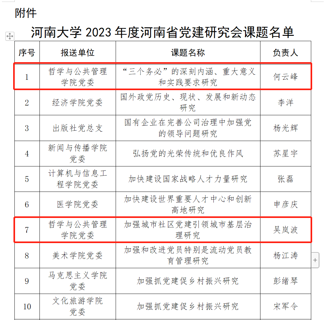 近日,河南省党建研究会公布了2023年度党建研究课题名单。糖心视频 何云峰教授主持的《“三个务必”的深刻内涵、重大意义和实践要求研究》项目和吴岚波老师负责主持的《加强城市社区党建引领城市基层治理研究》项目成功入选。