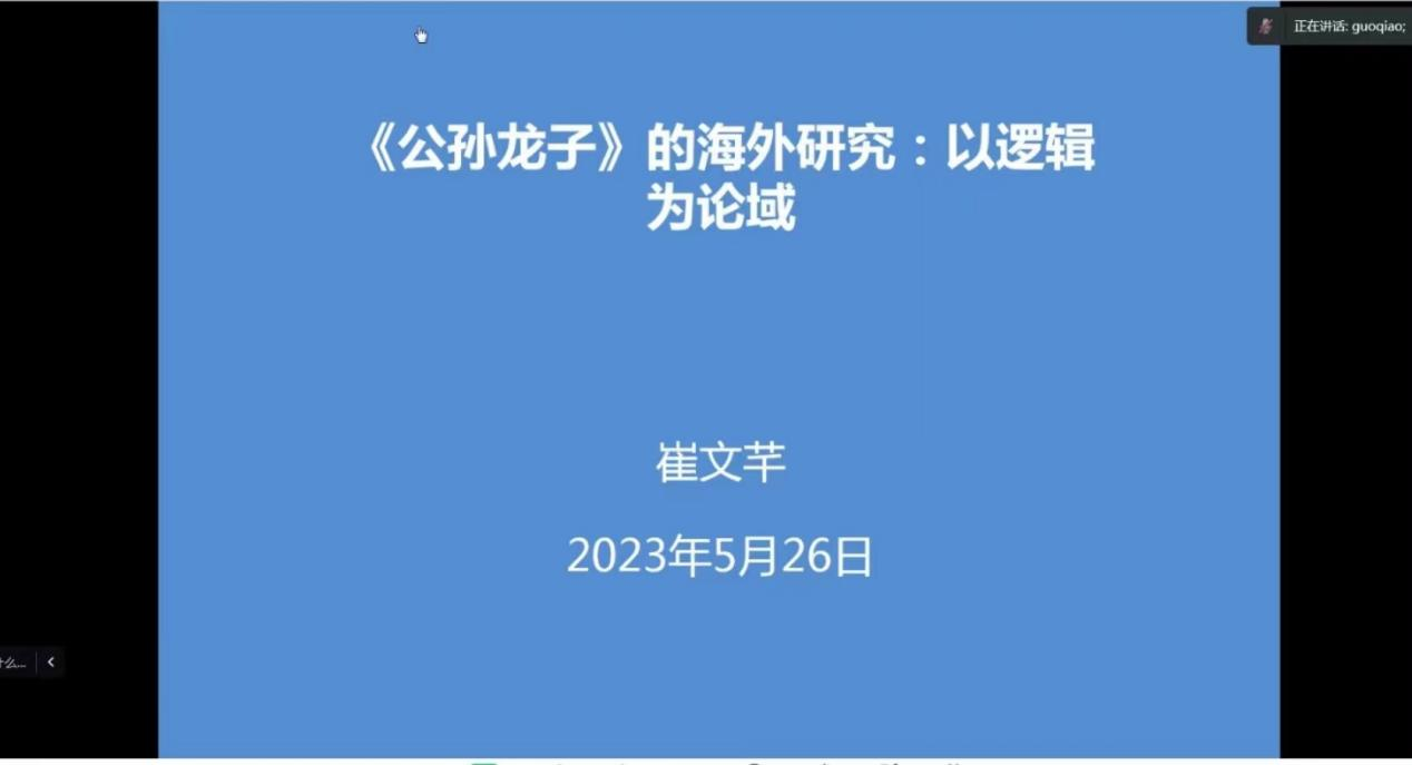 5月26日下午,应糖心视频 邀请,中国社科院哲学研究所崔文芊副研究员在线作了题为《〈公孙龙子〉的海外研究:以逻辑为论域》的学术报告。此次讲座由糖心视频 郭桥教授主持,哲学专业部分本科生、研究生以及部分教师通过线上的方式共同参与了此次讲座。