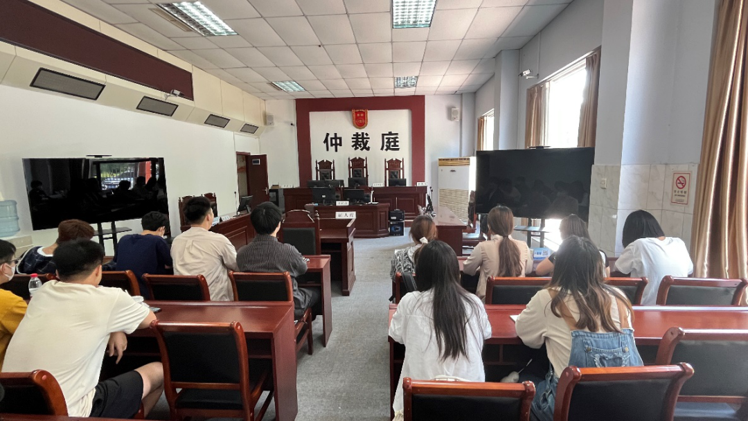 在仲裁庭上,仲裁员业务专业、细心严谨,庭审现场井然有序。在仲裁员的引导下,围绕案件的争议焦点,双方当事人提出自身诉求,按照法定程序展开充分的陈述、举证质证以及庭审辩论。在紧张而有序的庭审现场中,劳动与社会保障专业2020级同学端坐在旁听员位置,全神贯注,记录庭审现场的规范流程;耳听心受,听取争议案件的基本情况;凝练升华,学习当事人举证、质证、辩论技巧以及仲裁员处理复杂矛盾,维护公平正义的方法和经验。