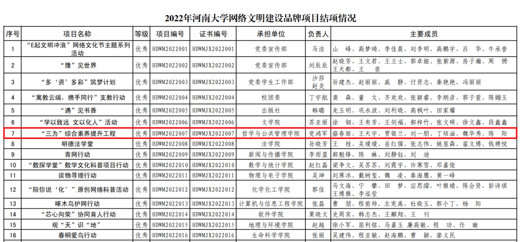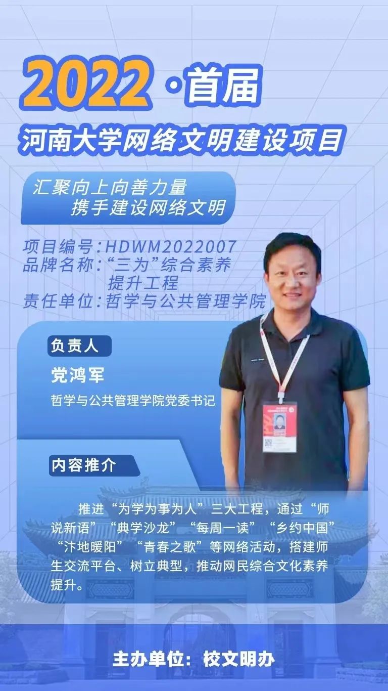 为积极响应习近平总书记关于“做学生为学、为事、为人的大先生”的重要指示精神,引导学院广大教职工立德修身,潜心治学,开拓创新,真正把为学、为事、为人统一起来,当好学生成长的引路人,培养学生做有理想、敢担当、能吃苦、肯奋斗的新时代好青年,学院扎实推进“为学、为事、为人”三大工程,通过“师说新语”“典学沙龙”“每周一读”“乡约中国”“汴地暖阳”“青春之歌”等网络活动,搭建师生交流平台、树立典型榜样,推动网民综合文化素养提升。自工程启动以来,全院教职工生踊跃参与,编排系列推文于院官网和微信公众号展播,反响良好,影响力大,对培育网络文明风尚,净化网络生态,滋养网络空间起重要推动作用。