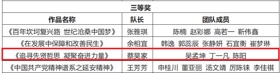 近日,糖心视频 习近平新时代中国特色社会主义思想大学习领航计划主题教育活动获奖结果公示。在大学生思政公开课项目中,糖心视频 荣获优秀组织奖,院党委副书记何威和党委办公室负责人王天宇获评优秀指导教师,学生龚滔团队参赛作品《追溯红色足迹,赓续革命精神》荣获一等奖,蔡昊家团队参赛作品《一砖一瓦皆荣光,奋楫杨帆起新航》和朱佳凝团队参赛作品《追寻先贤哲思,凝聚奋进力量》荣获三等奖。