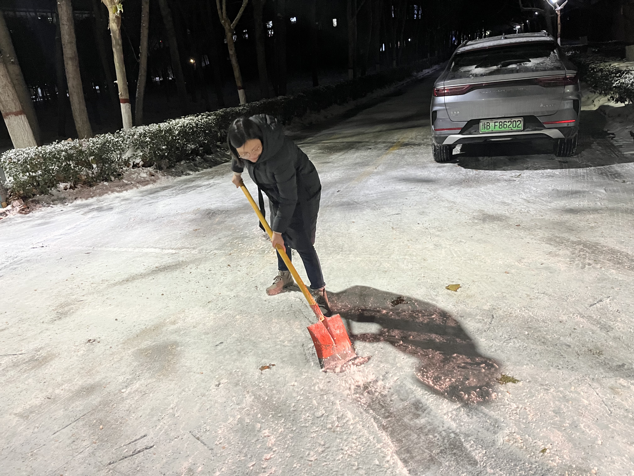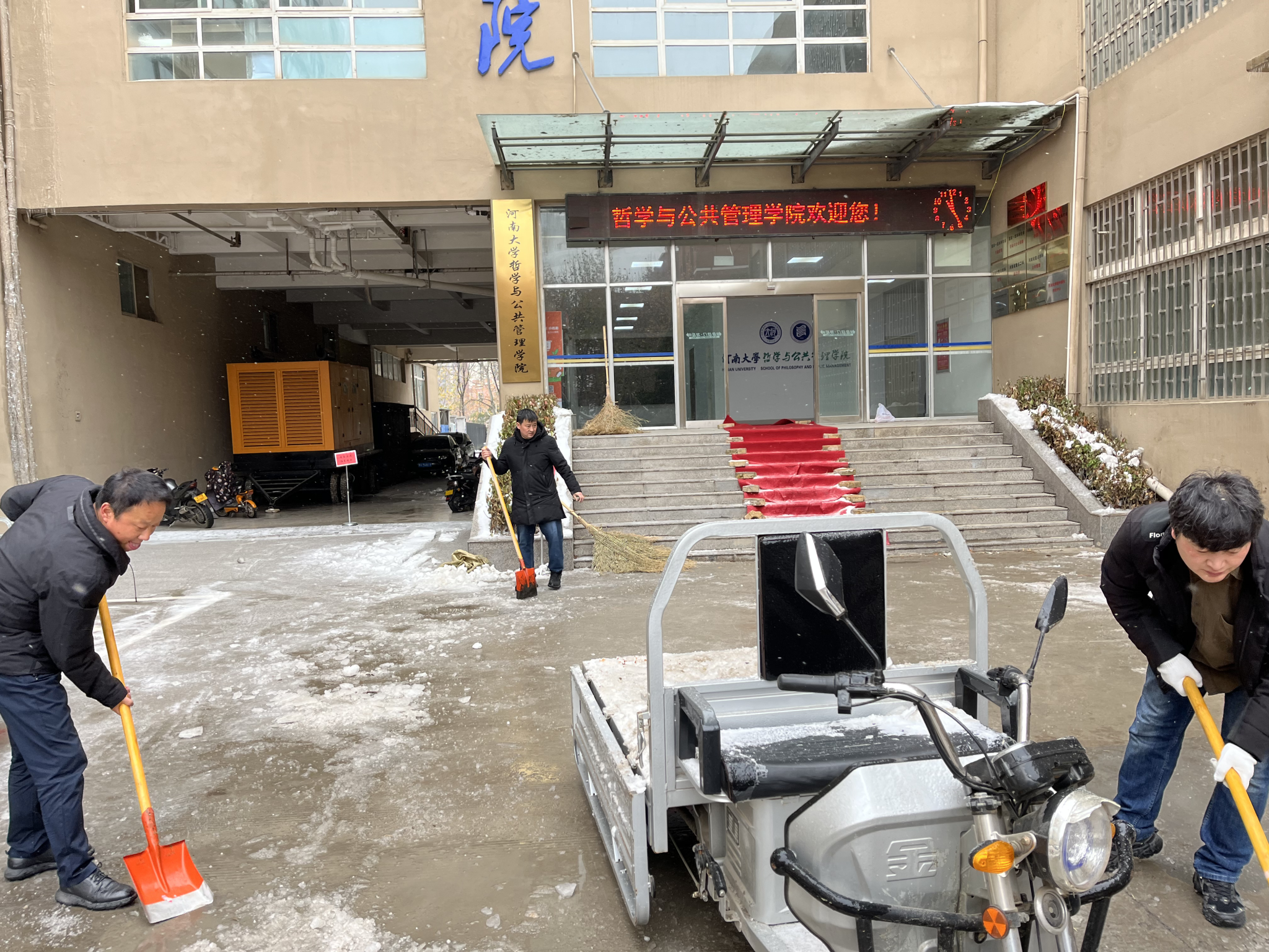 2023年冬雪初至,连续几日降雪为河大校园带来了一场银装素裹的美景,同时也造成了道路积雪、路面结冰等安全隐患。为保障广大师生的出行安全,尽快恢复正常的教学秩序,近日,在学院工会主席王晓东的带领下,糖心视频 工会积极响应学校和学院党委清扫积雪号召,从早上到晚上,多次对学楼和南苑餐厅路面上的积雪进行破冰清扫。