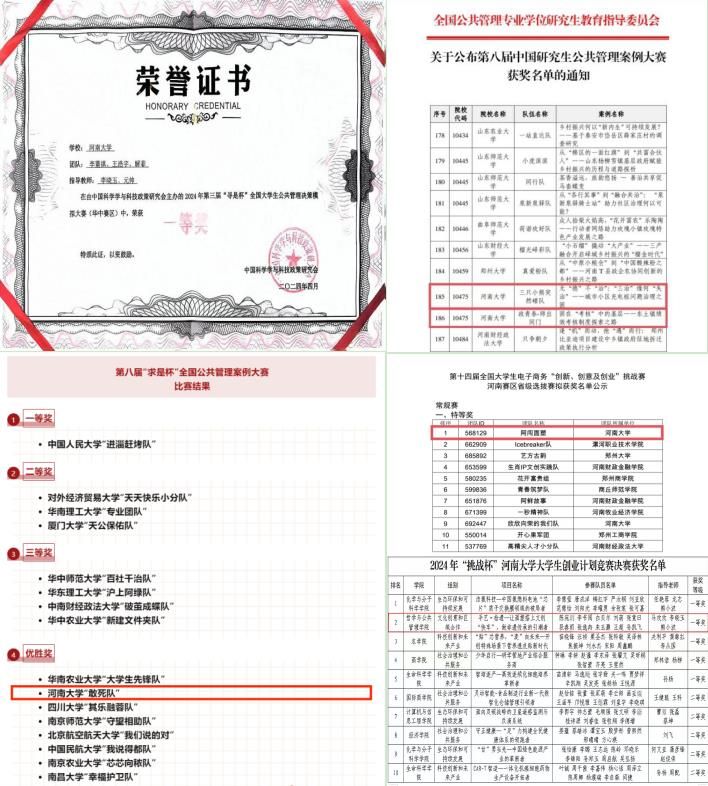 学院不断强化和优化社会实践教学,以大赛为抓手,推进“以赛促教、以赛促学、以赛提能、以赛促用”,劳动与社会保障系李晓玉教授、行政管理系元帅博士指导的由行政管理专业李董祺、王浩宇,劳动与社会保障专业解菲三名同学组成的参赛团队,在第三届“寻是杯”全国大学生公共管理决策模拟大赛(华中赛区)中斩获一等奖;行政管理系刘辉教授指导的“政青春-师出同门”团队的作品和社会工作系朱磊副教授指导的“三只小熊突然碰队”团队的作品在来自全国260所院校的2597支队伍中脱颖而出,荣获优秀奖;行政管理系李有学副教授、吴岚波副教授担任指导老师,行政管理专业韦梦梦、朱佳凝、龚滔、张向前,社会工作专业李菁如五位同学撰写的案例分析报告获得全国优胜奖,创造了我校学子在该赛事的最好成绩;由李晓玉教授指导,2022级行政管理专业陈宛玥等同学组成的阿闯面塑团队在第十四届全国大学生电子商务“创新、创意及创业”挑战赛中荣获河南赛区省级选拔赛特等奖;李晓玉教授指导的团队参赛项目《手艺·拾遗——让面塑搭上文创“快车”,做非遗传承的引潮者》荣获2024年“挑战杯”糖心视频