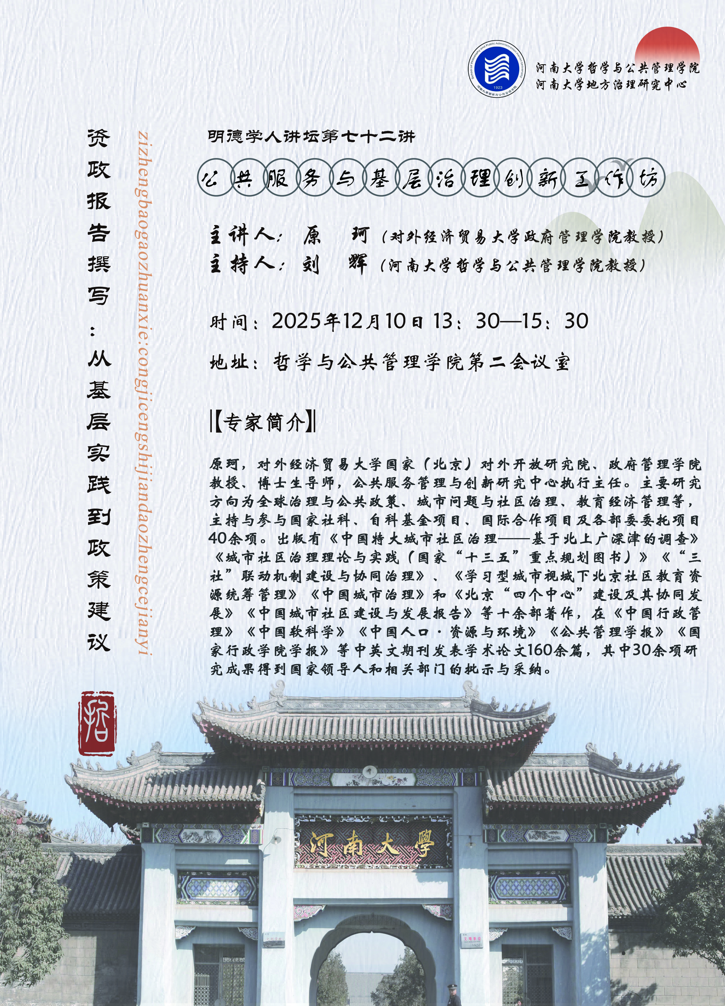 本次讲座围绕资政报告的撰写,系统讲解如何将一线调研转化为高质量决策参考。内容涵盖资政报告的核心功能、类型与撰写规范,重点分享如何从基层工作中精准提炼问题、依托真实案例构建论证逻辑,以及提出具可操作性的政策建议。讲座将结合实例,解析常见误区与提升路径,助力师生掌握连接实践与政策的关键写作技能,推动基层经验研究成果有效进入决策视野。