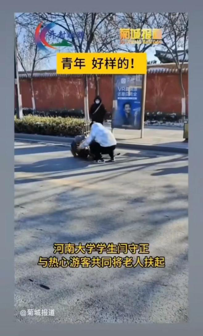 2022级研究生闫守正在天波杨府门口等车返校时,一位老人在对面站台等车时不慎跌落摔倒在快车道,闫守正迅速冲到老人身边,与热心游客共同将老人扶到路边坐下。为了防止老人受凉,他将自己的脚垫在老人身下,并及时拨打110。直到民警将老人送回家后,闫守正才放心离开。路过的群众对此纷纷竖起大拇指,“咦,这个孩真管!”“真是个热心好青年!”“嗯,河大的学生真不孬!”事后,开封市广播电视台在官方抖音号菊城报道中对其事迹进行了报道,受到了社会各界的广泛赞扬。